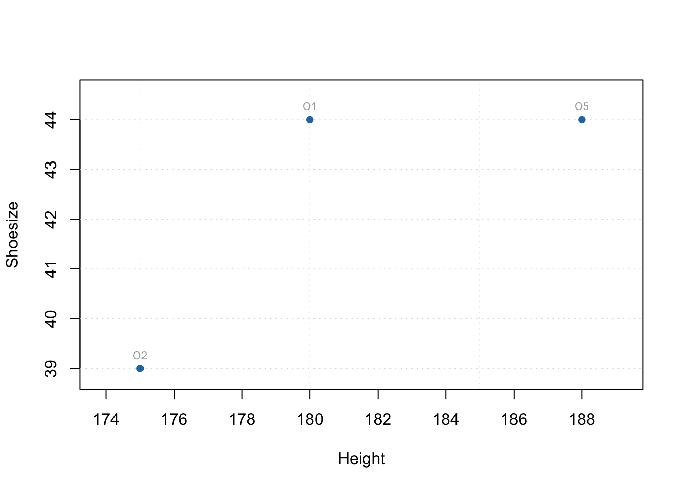 Now if you make a plot using function mdaplot() you will see only three points by default, because the other two a hidden. Also plot will be made for columns 1 and 3, because the second column (Weight) was also hidden. See the code and the result below: