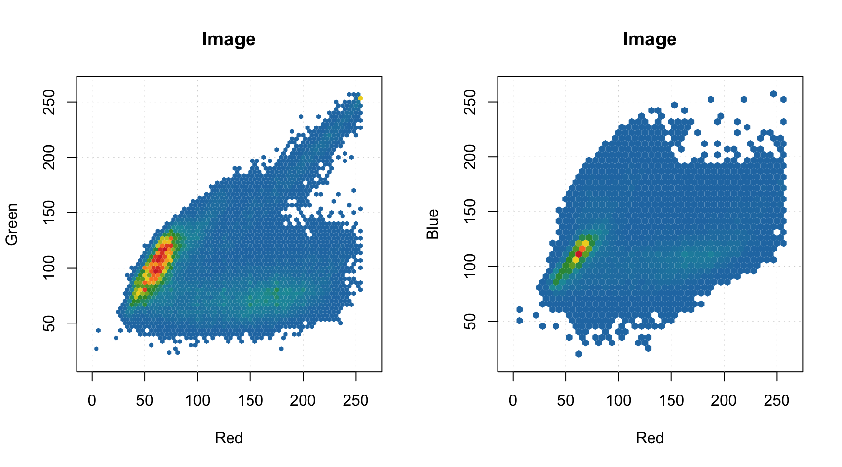 However, it will take some time to show these plots as this image has several hundreds of thousands pixels, a faster alternative can be the use density plot based on hexagonal binning. Use type = "d" for this as shown below. Number of bins can be adjusted by using parameter nbins.