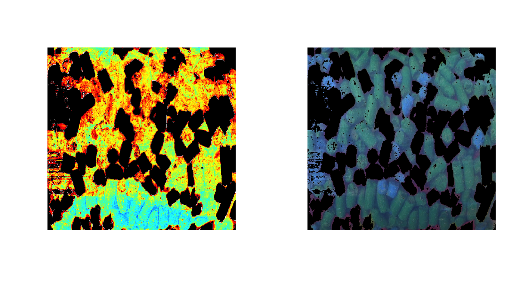 Another useful thing is to set some of the pixels as background. The background pixels are removed from the image dataset physically, there is no way to get them back (in cotrast to excluded rows/pixels). It can be particularly useful when working with e.g. geocorrected hyperspectral images, where, often, many pixels have NA values and there is no need to keep them in memory. To set pixels as background you need to use method mda.setimbg() with either pixel indices or vector with logical values as it is shown below.