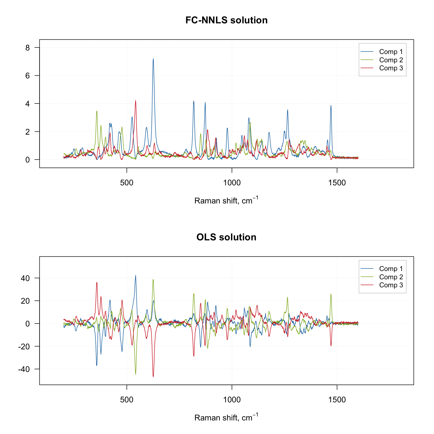 The default option is nr. 3 and this is what we would recommend to use. It gives a solution identical to nr. 2 however is much faster in case of multivariate data. You can also provide a function, which implements your own solver. The solver can be changed both for spectra and for contributions, you can even use different solvers for each. The code below shows how to apply MCR-ALS using OLS and FC-NNLS solvers without any constraints.