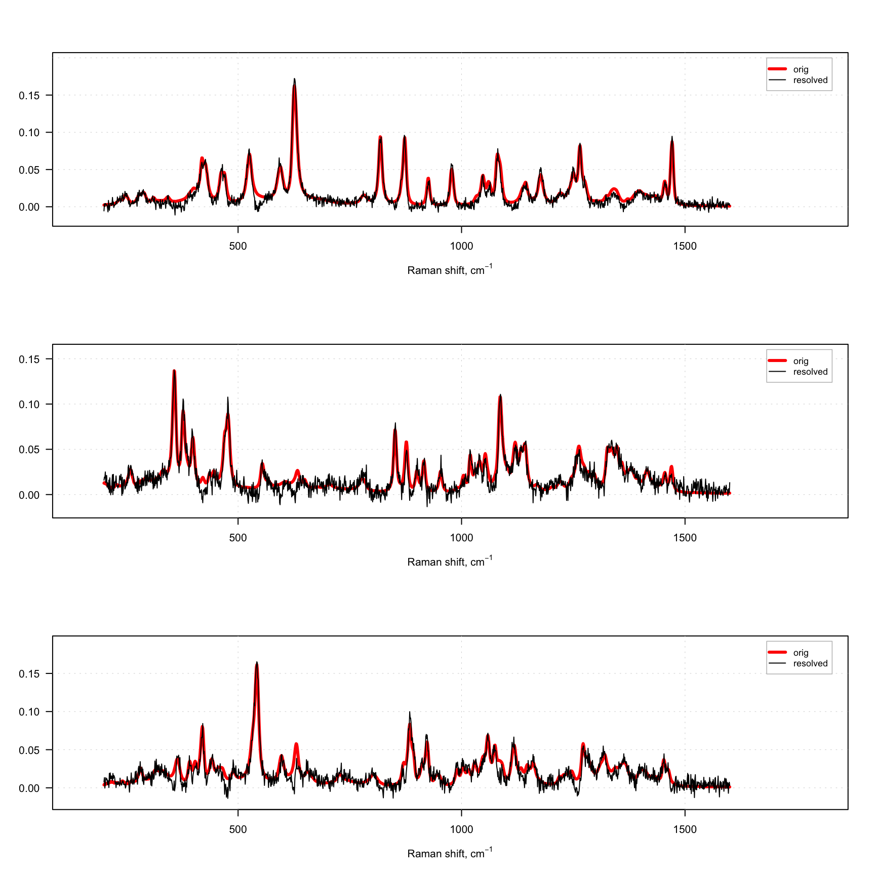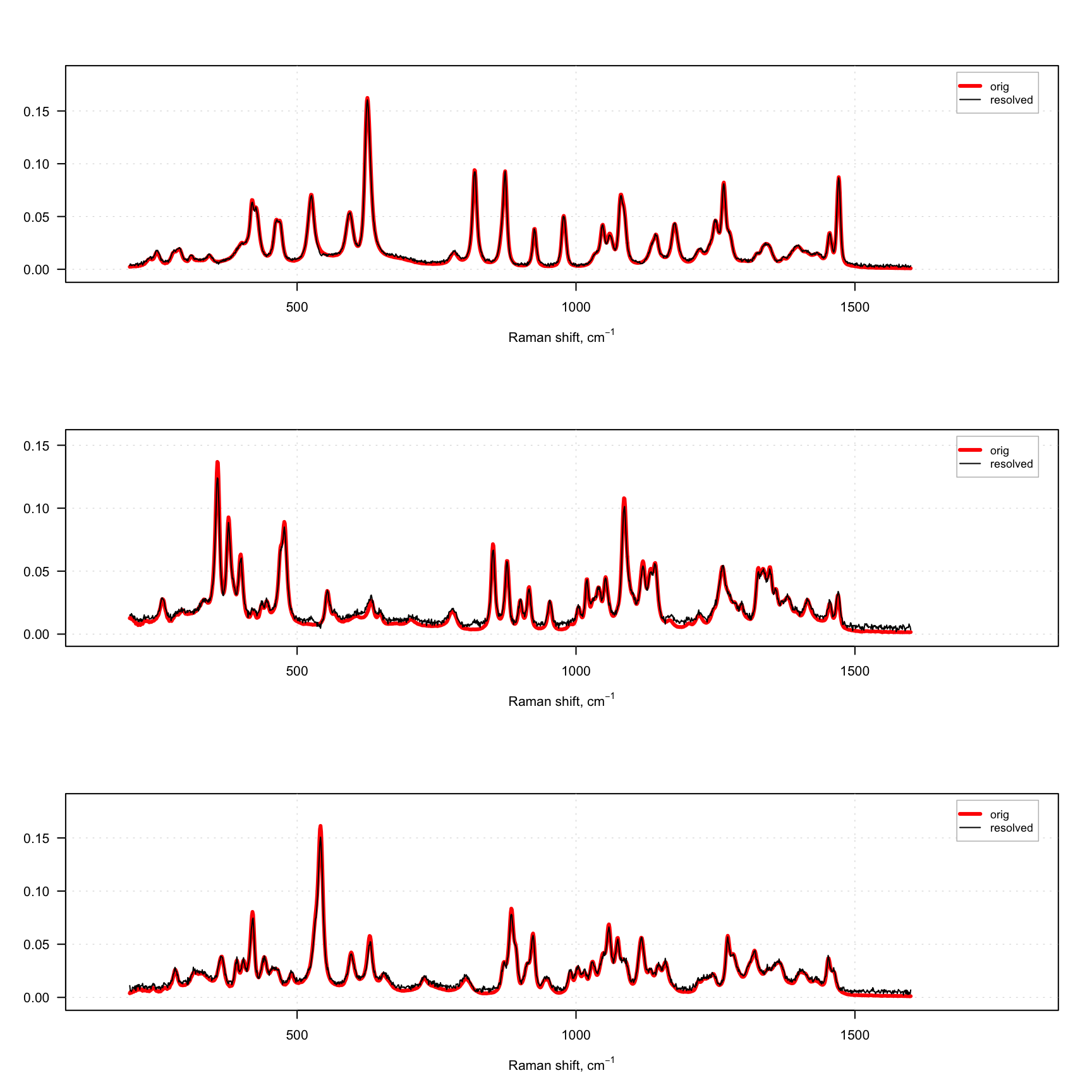 mdaplotg(list(orig = s, resolved = s.hat), type = "l", col = col, lwd = lwd)
