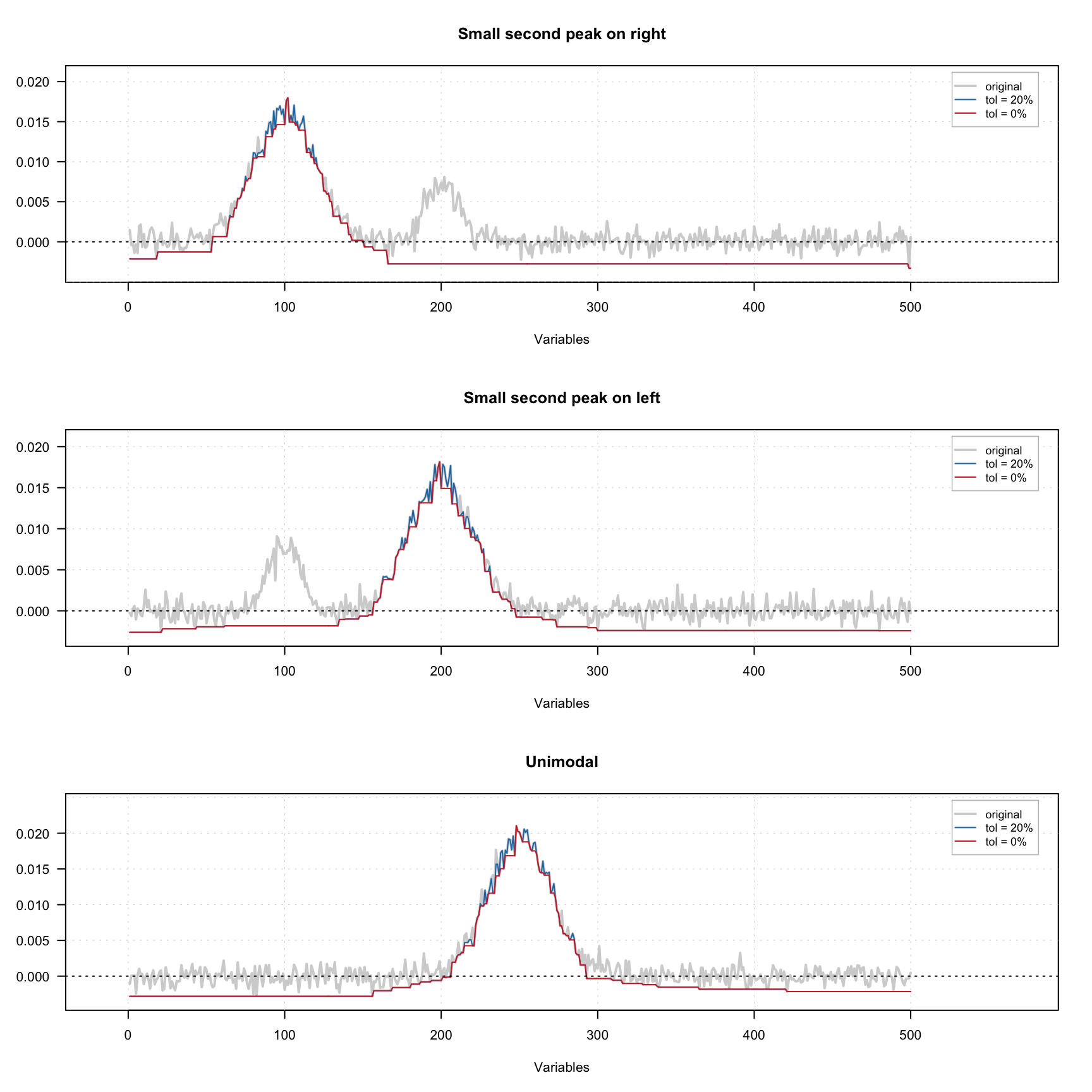 The figure below shows how the constraint works using three signals — one with small extra peak on the left, one with small extra peak on the right and one unimodal signal. A small amount of noise was added to all signals. There are one original signal (gray) and two constrained signals on the plot. The red one shows the result for 0% tolerance and the blue one shows the result for 20% tolerance.