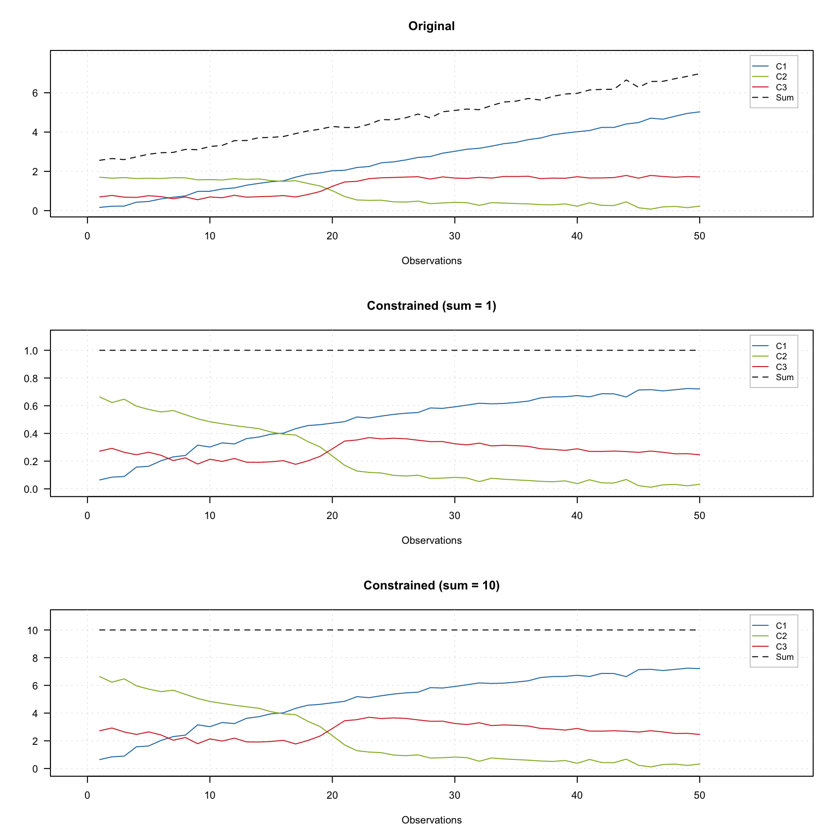 As you can see in the last two plots, the dashed line show the constant desired value for all measurements. In order to add the constraint use constraint("closure") for unit sum or constraint("closure", params = list(sum = 10)) for e.g. 10.