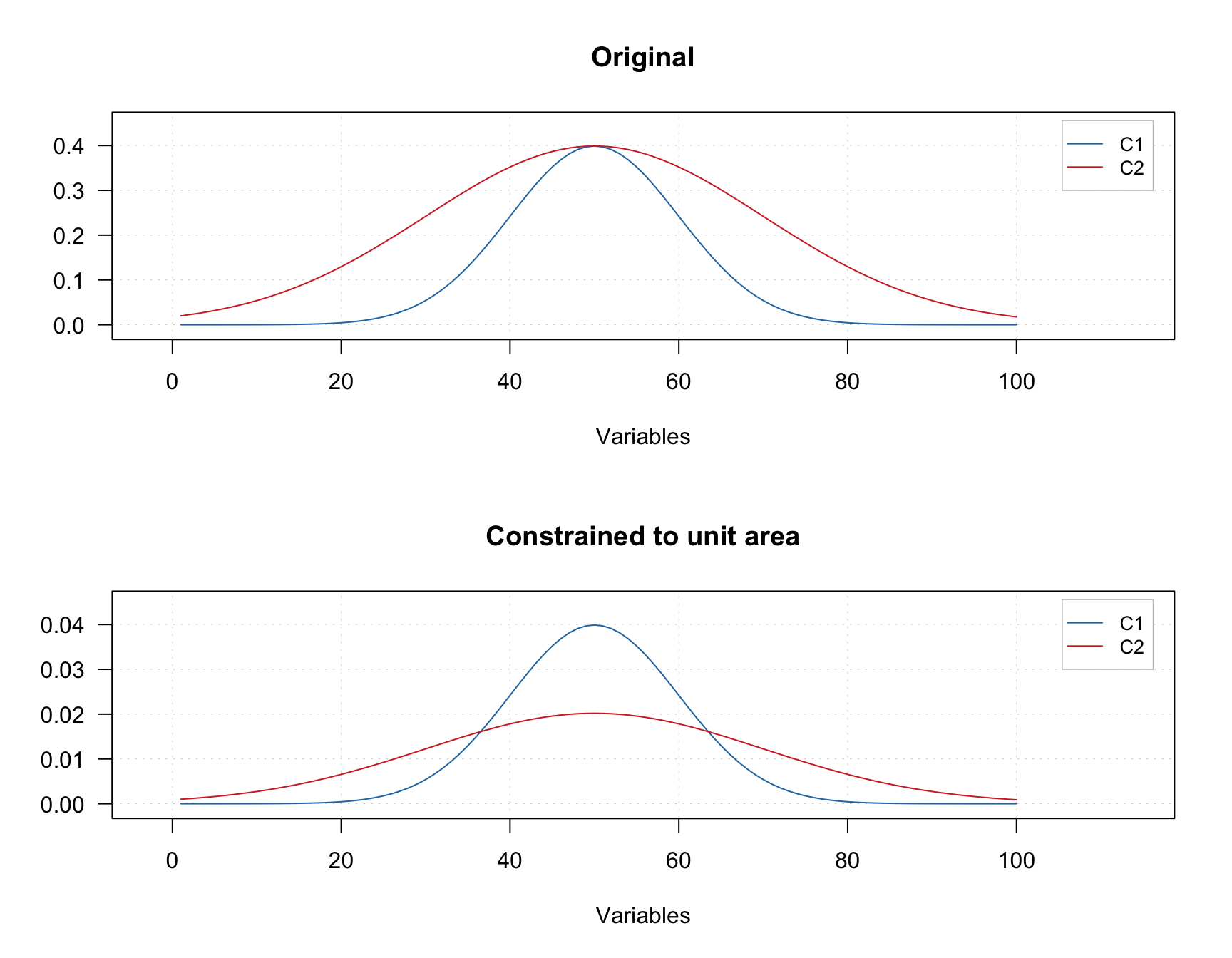 An example below shows two original signals and the result of normalization of the signals to the unit area (so area under each curve is equal to one).